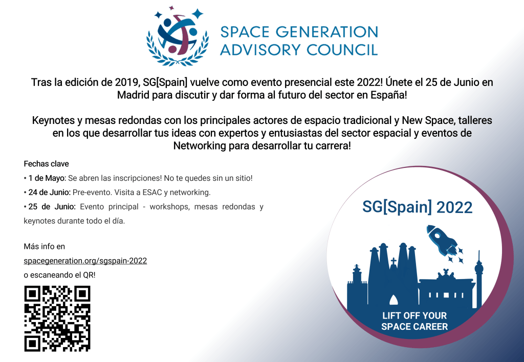 The Spanish delegation of the SPACE GENERATION ADVISORY COUNCIL (SGAC) is organising the second edition of SG[Spain]. The event is aimed at young professionals and students and will be attended by experts in the field who will give lectures, round tables and workshops.