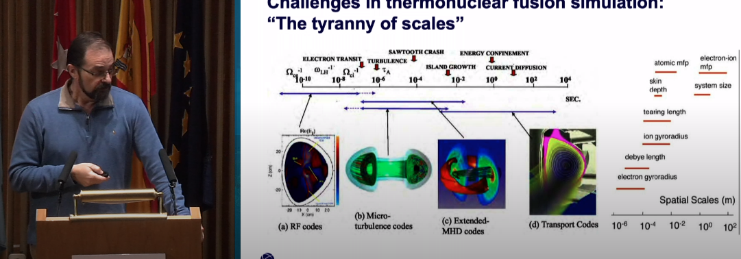 Plasma systems are notoriously multiscale temporally and spatially, and very difficult to model accurately when collisional processes are subdominant. Such conditions are pervasive, for instance, in thermonuclear fusion plasmas. To simulate such plasma conditions with high fidelity, one must solve the so-called Vlasov-Fokker-Planck (VFP) equations (or suitable approximations thereof), coupled with Maxwell’s equations. The VFP+Maxwell system is a high-dimensional (6D+time), integro-differential, nonlinear, nonlocal set of equations describing multiple plasma species interacting collisionally and via electromagnetic fields. The solution to the VFP system is constrained by positivity and collisional invariants (mass, momentum, and energy), which must be respected by the numerical representation for long-term solution accuracy. The VFP model admits myriad asymptotic approximations that lead to useful reduced models in certain limits. In this presentation, we will introduce the challenges in simulating fusion-grade plasmas, outline various algorithmic solutions to these challenges (exploiting, in particular, the asymptotic richness of the VFP system), and dive into modern implicit multiscale methods with applications to both magnetic and inertial confinement fusion simulations.