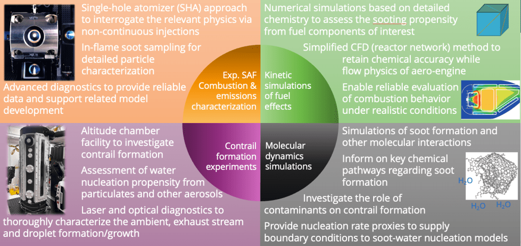 This talk provides an overview of recent progress on the aero-propulsion program at Sandia National Labs. After a brief introduction of Sandia, the Combustion Research Facility and the Applied Combustion department, we will go through the recent and ongoing research projects. Our aviation program is divided into two main parts: Combustion research and contrail formation; both efforts being based on the experimental output of dedicated facilities, aiming at emulating reference systems at relevant conditions. The combustion program focuses on providing fundamental understanding of spray, combustion and emissions (soot formation) at pressures relevant to modern and next generation aero-engines, but also aims at producing data for different fuels, with an emphasis on low fuel volume requirements. The atmospheric nucleation facilities experimentally investigates contrail formation, mostly focusing on the nucleation and initial growth. A common ground for all experimental work is their reliance to non-intrusive diagnostics, applying a large array of optical techniques to study the different processes in detail. The two axes of research are also accompanied by simulation efforts, covering a range of fundamental and applied approaches.