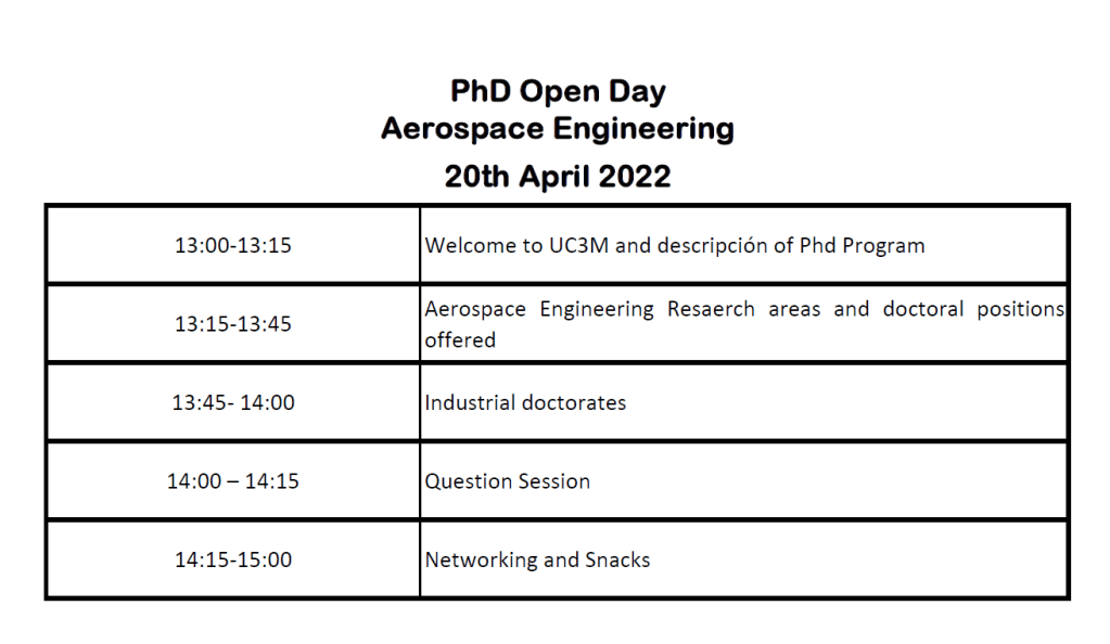 You’ll be able to talk to the director of the Aerospace Engineering PhD programme and our academic staff, see short presentations, learn about a wide spectrum of predoctoral positions we will be openning for the academic year 2022-2023.